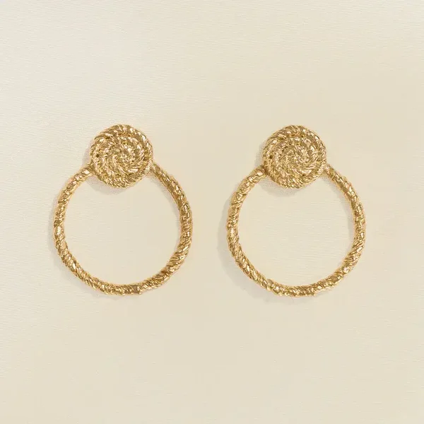 Twisted circle hoop earrings with a braided spiral accent at the base.